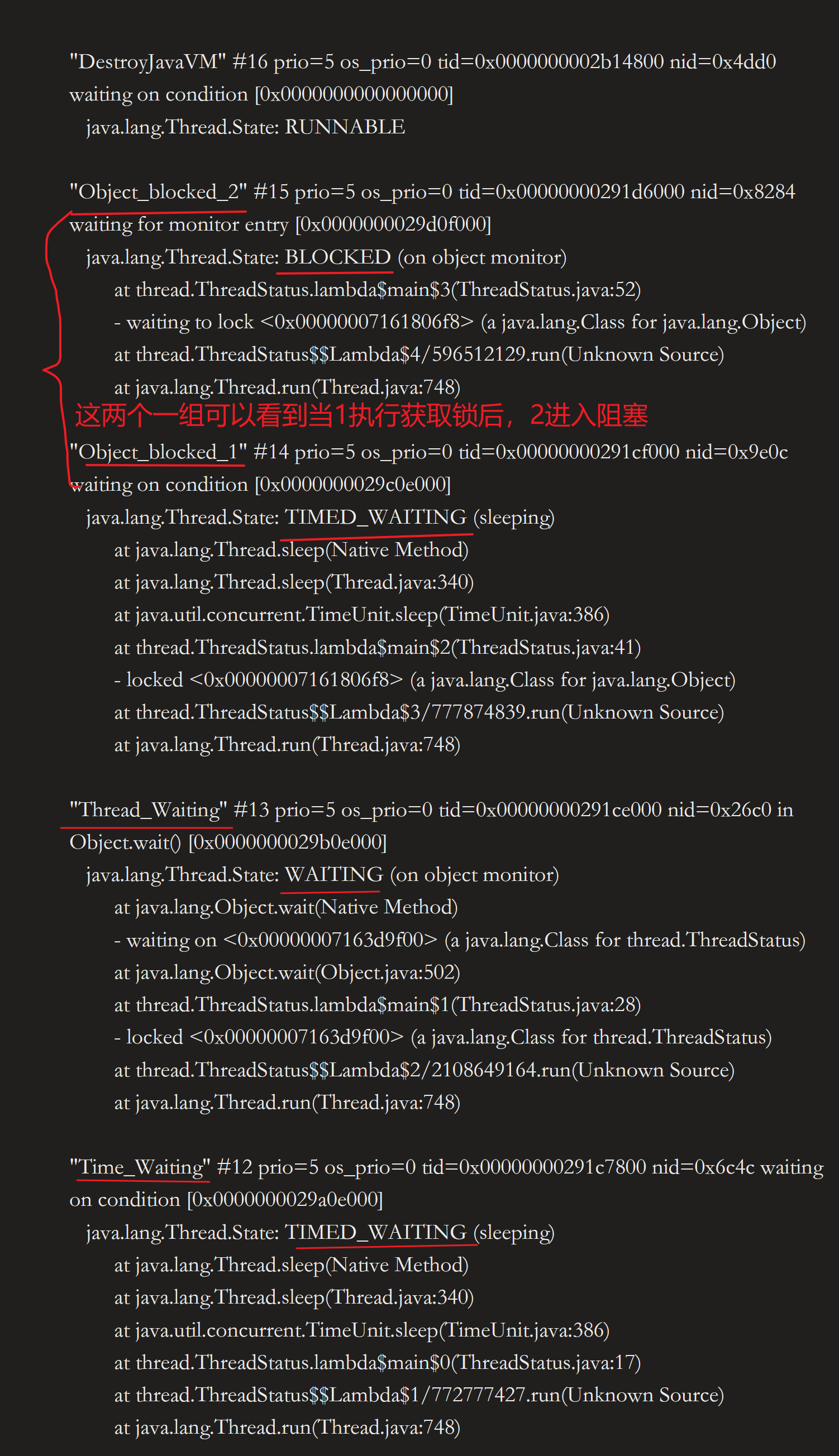 BLOCKED:阻塞状态,表示线程进入等待状态, 也就是线程因为某种原因放弃了 CPU 使用权,阻塞也分为几种情况