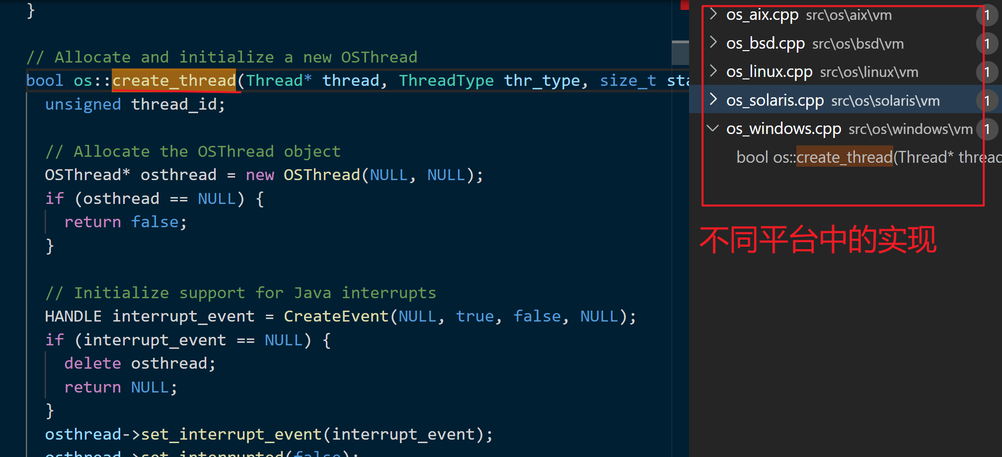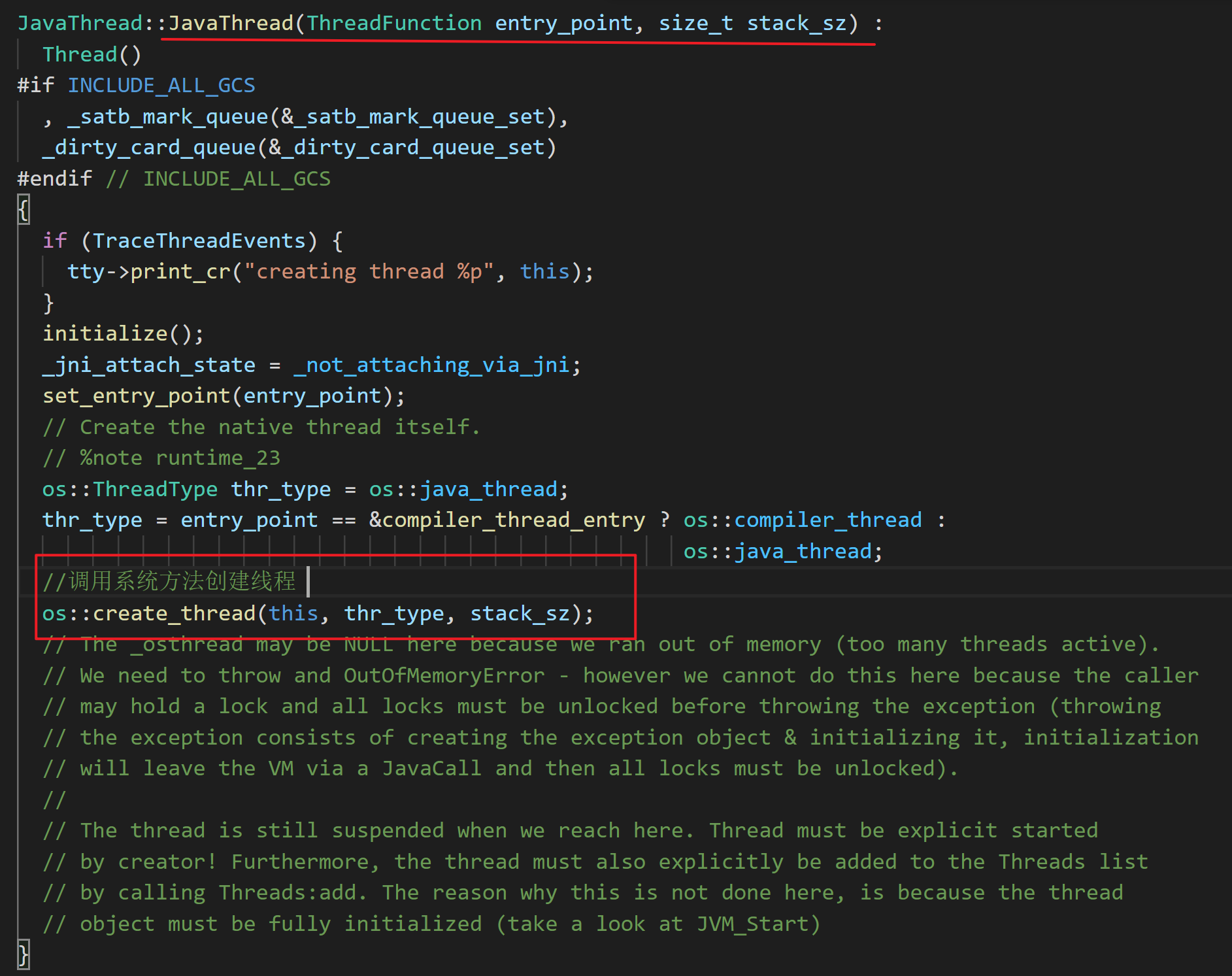 os::create_thread(this, thr_type, stack_sz);来实现线程的创建,对于这个方法不同平台有不同的实现,这里不再赘述,