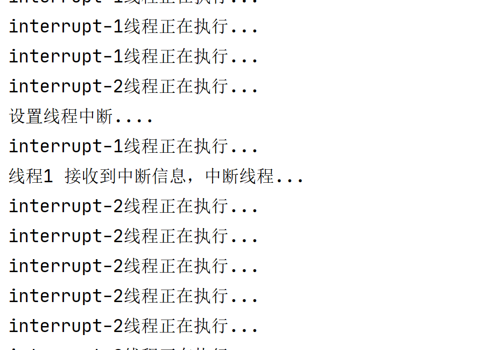 interrupt-1线程,其中用interrupt来判断当前线程是否处于中断状态,如果处于中断状态那么就自然结束线程,这里的结束的具体操作由我们开发者来决定。再创建interrupt-2线程,代码相对简单不阐述,当执行到某时刻时将线程interrupt-1设置为中断状态,也就是通知interrupt-1线程。