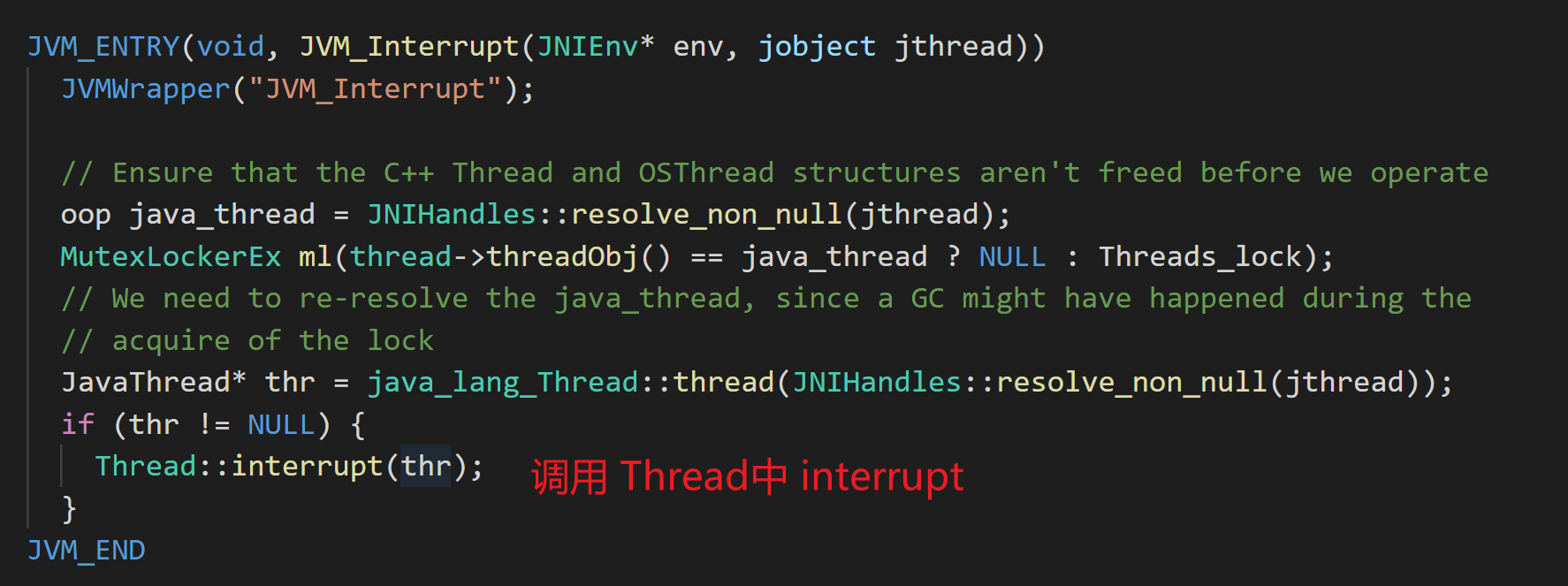 interrupt方法中最终调用了Native方法interrupt0,这里相关在线程启动时说过,不再赘述,我们直接找到hotspot中jvm.cpp文件中JVM_Interrupt方法
