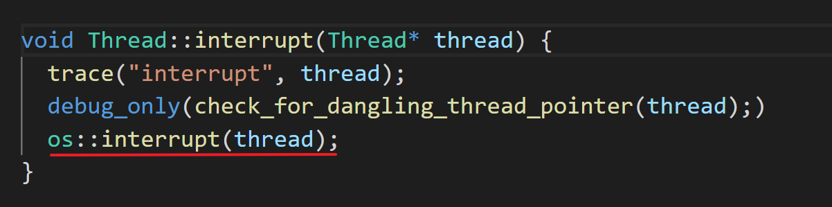 os::interrupt(thread)这里是调用了平台的方法,对于不同的平台实现是不同的,我们这里如下所示,选择Linux下的实现os_linux.cpp中,