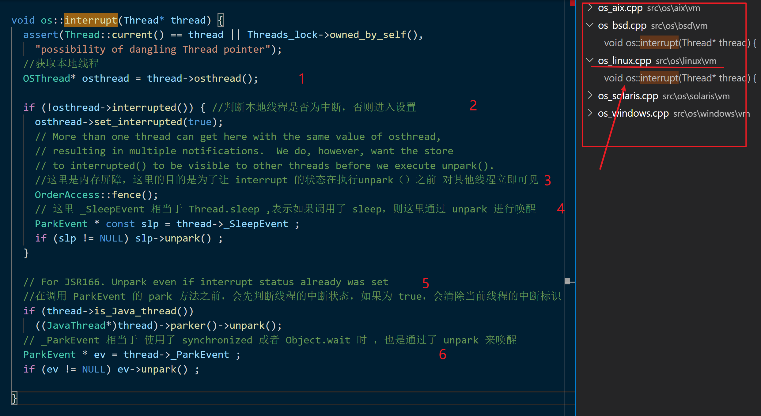 1处拿到OSThread,之后判断如果interrupt为false则在2处调用OSThread的set_interrupted方法进行设置,我们可以进入看一下其实现,发现在osThread.hpp中定义了一个成员变量volatile jint _interrupted;而set_interrupted方法其实就是将_interrupted设置为true,之后再通过ParkEvent的unpark()方法来唤醒线程。具体的过程在上面进行的简单的注释介绍,