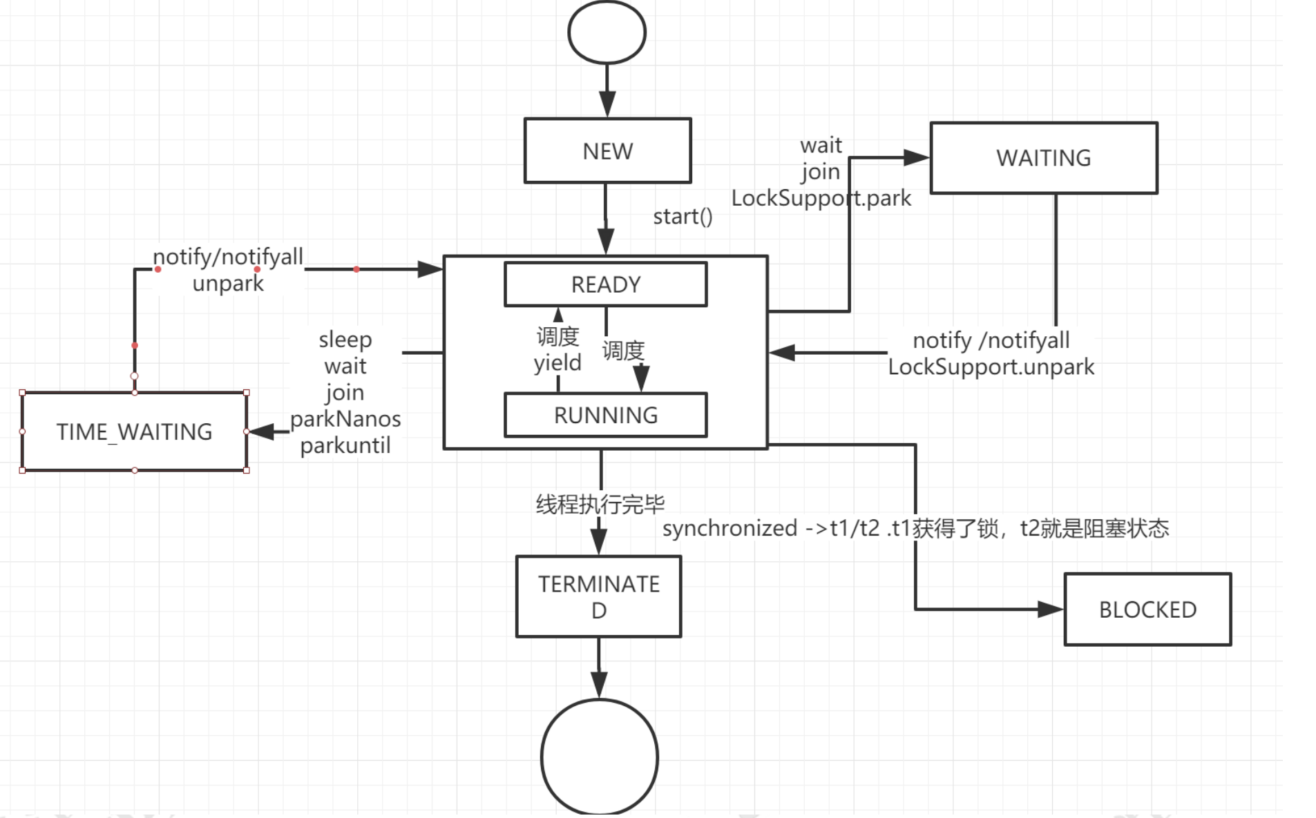 RUNNABLED:运行状态,JAVA 线程把操作系统中的就绪和运行两种状态统一称为“运行中”