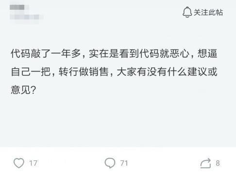 程序员是一个经常和代码打交道的职业,而代码也是程序员安身立命的根本,按理说看到代码应该感到熟悉亲切才对。然而,要是和你说有一位程序员的转行原因是因为看到代码就恶心!实在是不想再敲代码了,打算转行销售了。