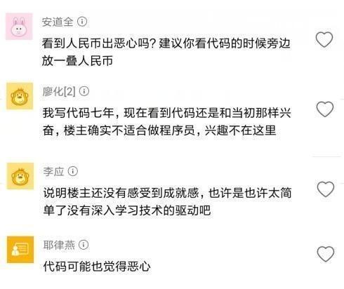 有网友认为,看到代码就感觉恶心的人,水平也高不到哪里去。正所谓兴趣是最好的老师,如果你连敲代码都觉得没兴趣的话,你的水平也不会高到哪里去,或者你说你还没有代入感,没有深入学习的动力吧。