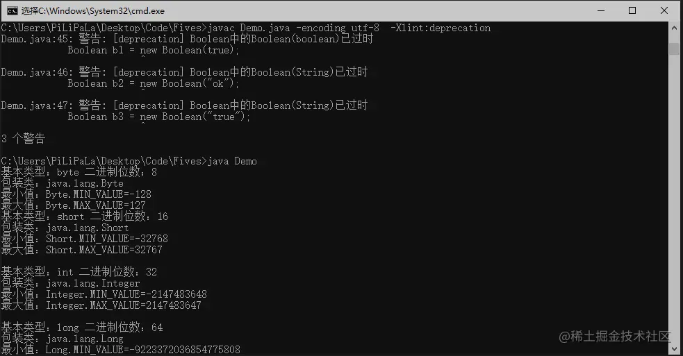 在我们要进行编译时也会弹出提示,并且我们编译时的命令多了一些参数javac Demo.java -encoding utf-8 -Xlint:deprecation这是因为Java 1.5 版本之后可以自动拆箱装箱。
