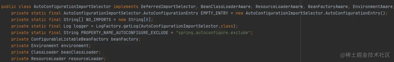 这里导入的是上面第二种 importSelector,这是一种动态注入 Bean 的技术,我们把 AutoConfigurationImportSelector 点进去,发现它实现了 ImportSelector 接口。