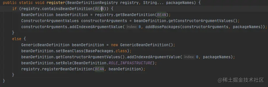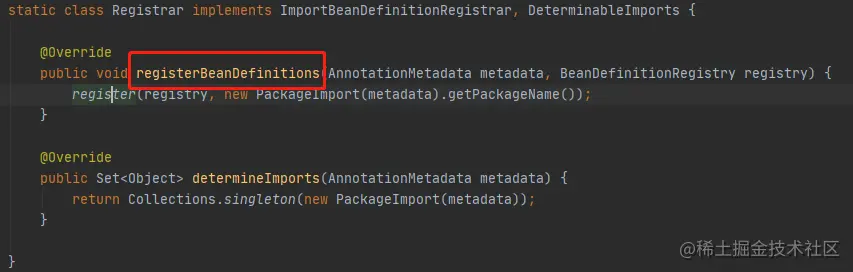 核心的就是registerBeanDefinitions:表示的含义就是在默认的情况下就是将:主配置类 (@SpringBootApplication) 的所在包及其子包里边的组件扫描到 Spring 容器中。