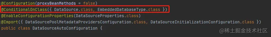DataSourceAutoConfiguration 点进去看发现线面这个条件注解,当存在DataSorce.class和EmbeddedDatabaseType.class被classloader加载,则这个配置类生效。