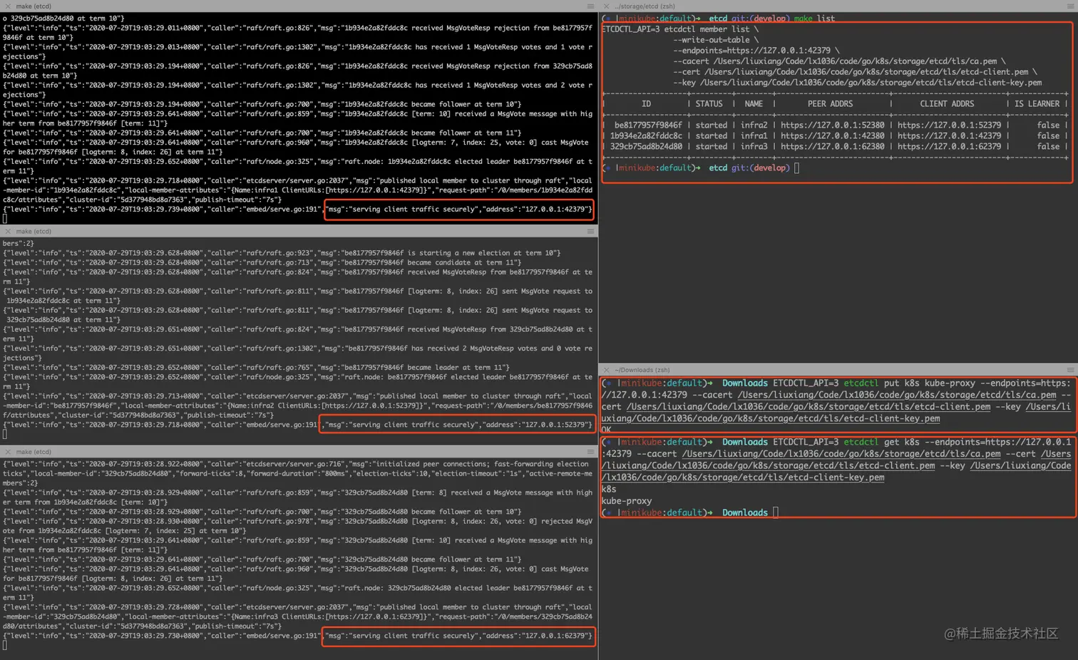 在三个终端分别执行 make etcd1-auth、make etcd2-auth和make etcd3-auth,就搭建了一个3节点的etcd cluster了,并且etcd1/etcd2/etcd3的监听在客户端的端口分别是42379/52379/62379。并且能正常读写数据: