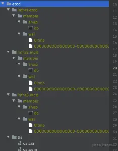 并且,etcd支持数据持久化,k-v数据保存在b+tree里。etcd数据存储在当前目录下,有snap和wal文件。snap文件是快照文件,存的是全量数据;wal是增量数据,当wal里的key达到一定数量时会自动生成快照。这种设计可以提高性能减少内存压力: