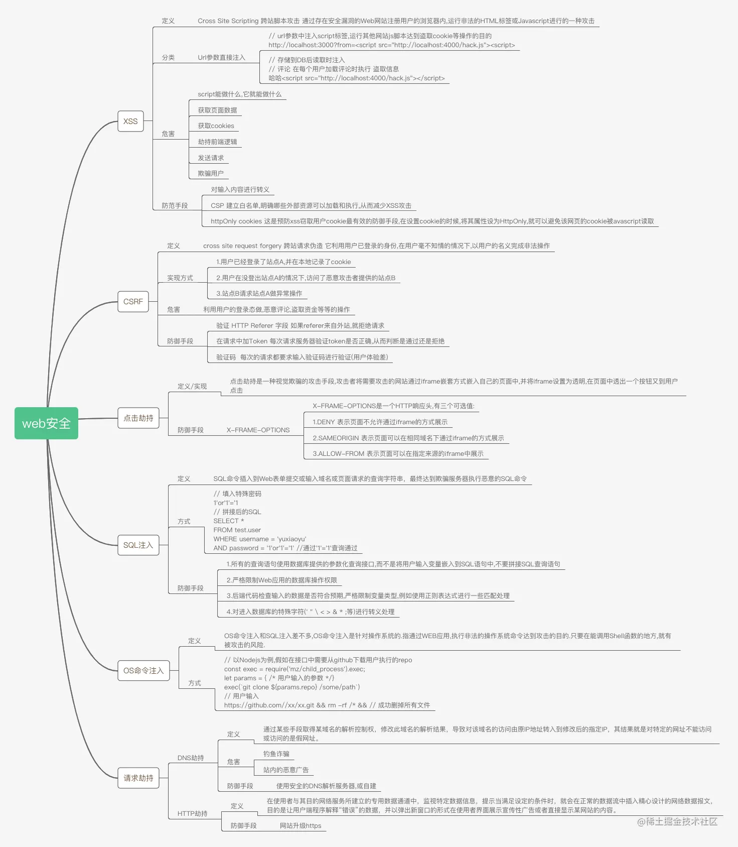 web安全常见情况总结 于鹏_yuxiaoyu 2020-10-10 495 阅读1分钟 总结了一下web安全的常见情况,分享一下思维导图: XSS CSRF 点击劫持 SQL注入 OS命令注入 请求劫持 最后放一张完成的图片
