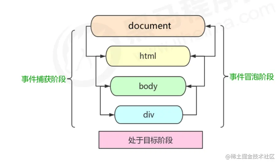 通俗来说,我们向水里面扔一块石头,首先它会有一个下降的过程,这个过程就可以理解为从最顶层向事件发生的最具体元素(目标点)的捕获过程;之后会产生泡泡,会在最低点( 最具体元素)之后漂浮到水面上,这个过程相当于事件冒泡。事件冒泡本身的特性,会带来的坏处,也会带来的好处,需要我们灵活掌握。