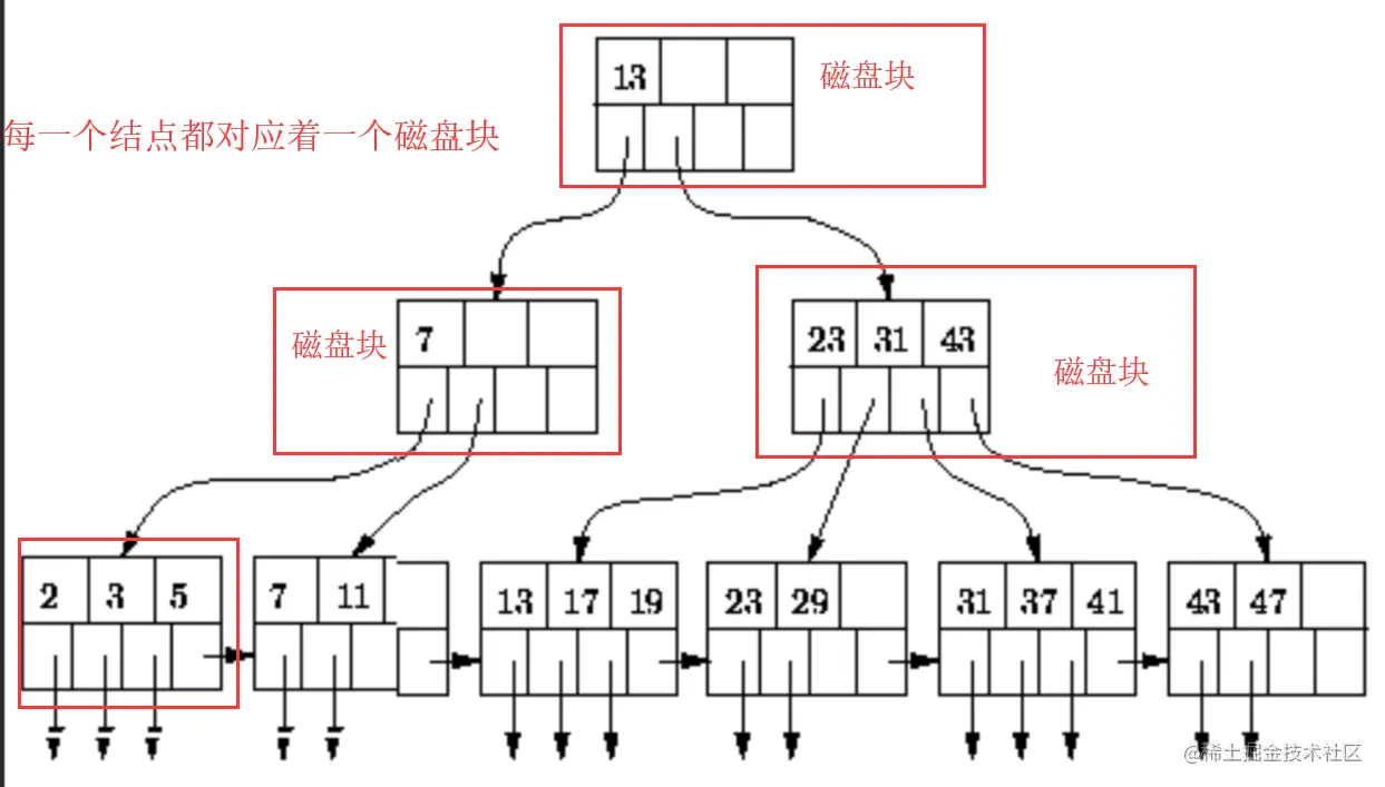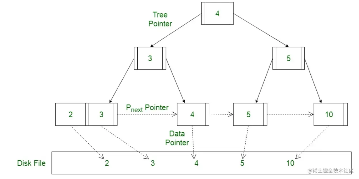 - 叶子节点还有一个指向其相邻叶子的指针。