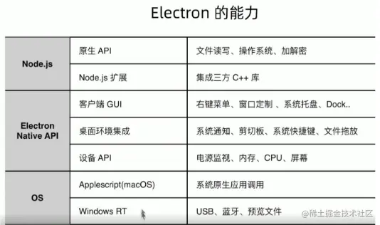 1)Electron的原生能力主要是源于两个方面:Electron内置的Native API以及强大的Node.js。