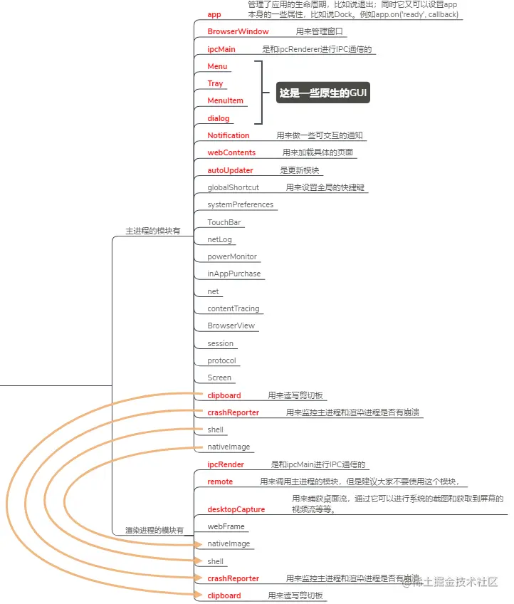 主进程管理着原生GUI,典型的窗口(BrowserWindow、Tray、Dock、Menu)。