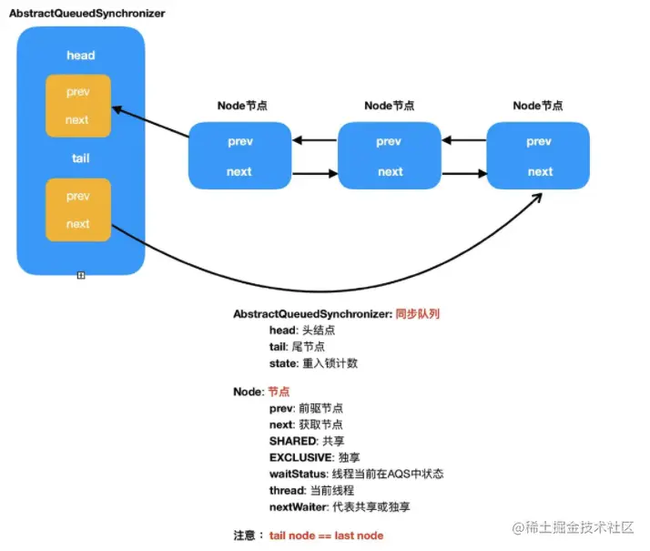 tail节点是null, 则需要实例化同步对列,也就是AQS, 通过调用initializeSyncQueue进行初始化操作,通过VarHandle设置AQS的head指向一个新建节点 (new Node) , 然后将head节点的引用赋值给tail节点。这里注意一下,是将head节点的引用赋值给tail节点, 也就是这时候head节点 和tail节点是同时指向一块内存地址 , 这里的用意就是在新建队列的时候,head节点和新建节点的prev节点要保持是同一个引用 ,因为在后续的判断中, 获取可执行权的条件就是AQS的head节点是否等于当前节点的prev节点。因为