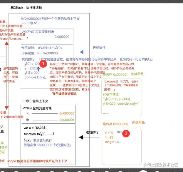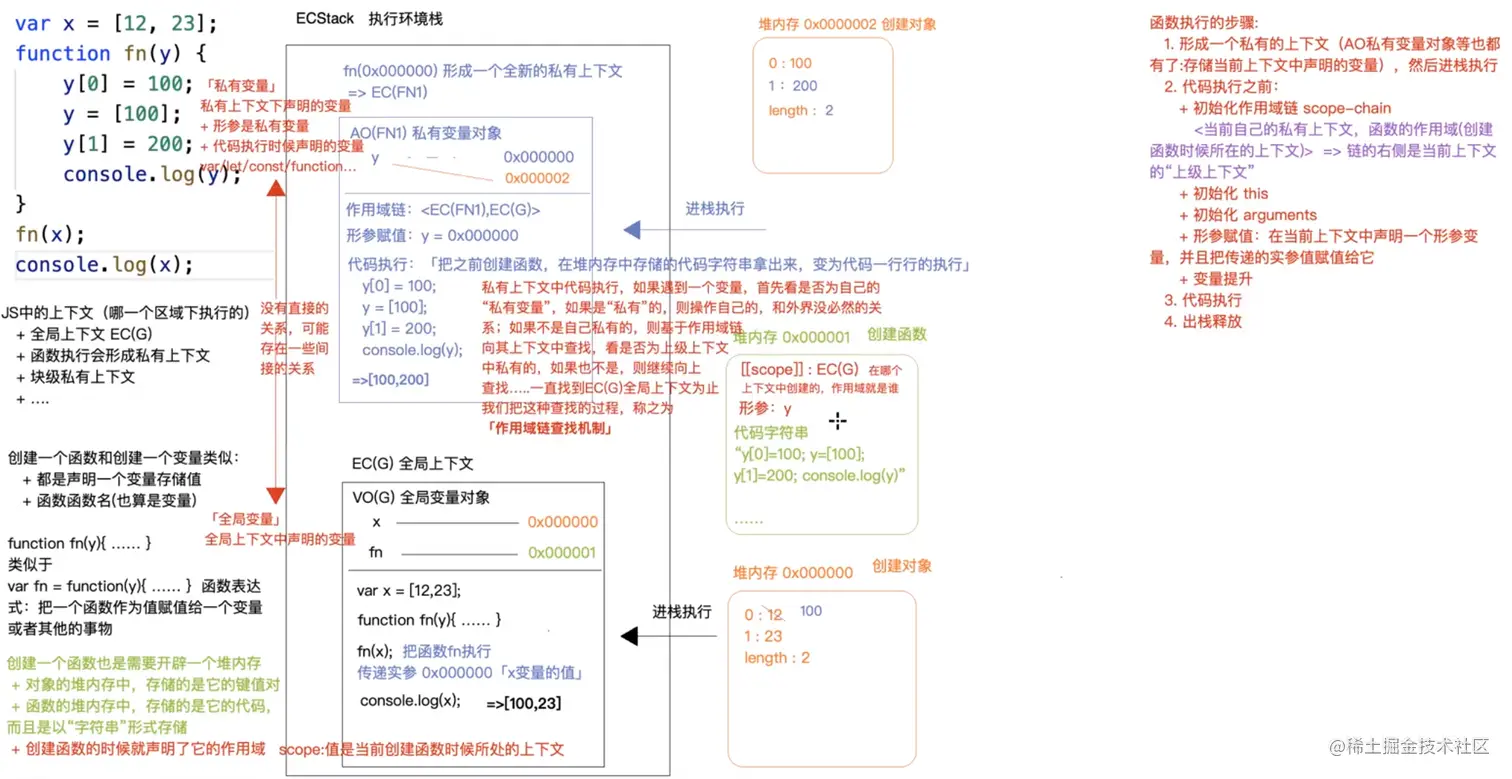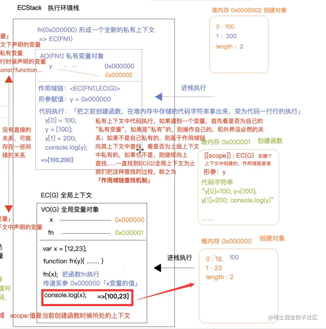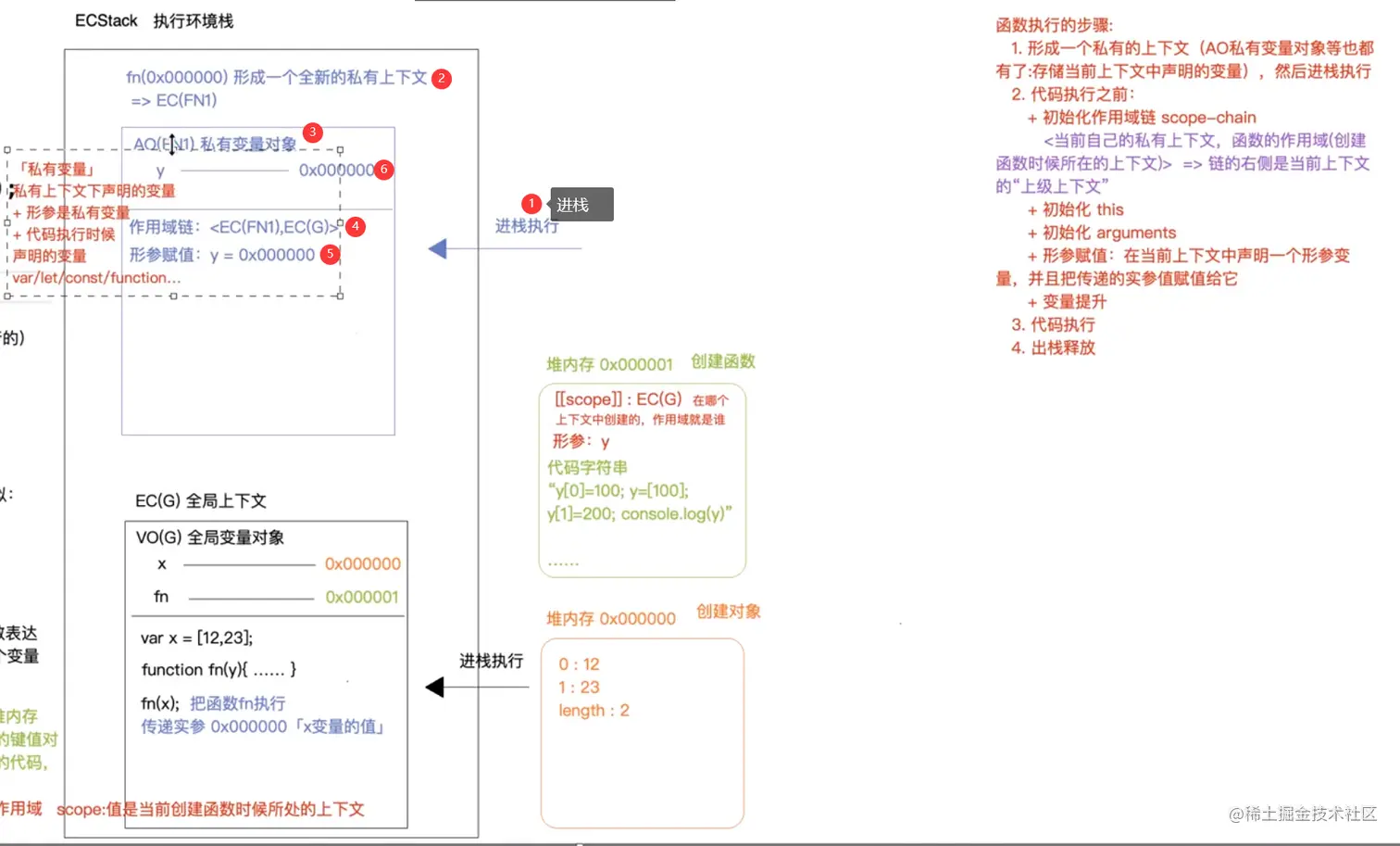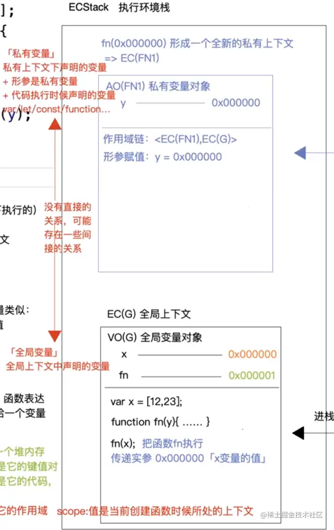 fn(x)传的是外部x的值,即x指向的0x000000堆内存地址。也就是说,那块栈内存上放的无论是基本类型的值,还是Object类型的堆内存地址,是什么,就传进来什么。所以如果传入的是引用类型的形参,对形参进行属性操作的时候,外部的引用类型也会改变,因为本质上改变的是同块堆内存。 fn(0x000000)形成一个全新的私有上下文EC(fn)- 在函数形成的新的上下文中,生成一个私有化变量对象AO,用来存储当前上下文中声明的变量(Active Object活动对象,简称AO,变量对象的一种,类似全局上下文中的全局变量)