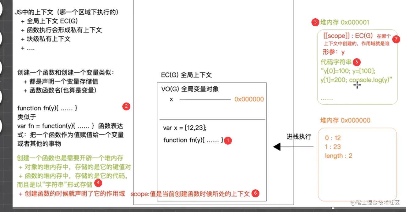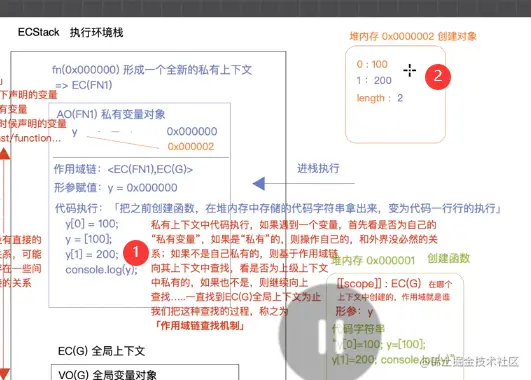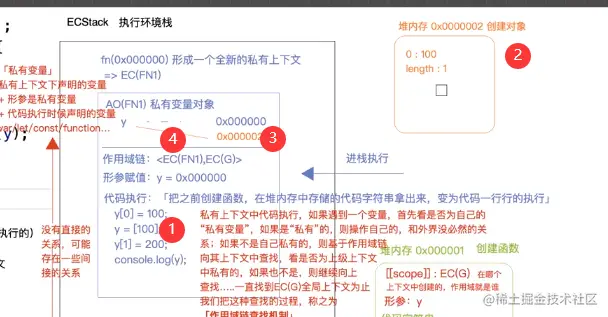 - 初始化作用域链scope-chain <EC(fn1),EC(G)>,链的两头是 <当前自己的私有上下文,函数的作用域(创建函数的时候所在的上下文)>,链的右侧也叫当前上下文的'上级上下文'