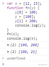 接着执行外面的console.log(x);,此时的x为全局变量对象中的x,对应的地址为0x000000,所以直接进行输出[100,23]