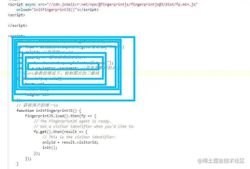 页面中,引入,然后在下面的initFingerprintJS这个函数中的回调中,就可以在回调的函数中获取到20位的用户的ip,然后就可以执行初始化的函数,渲染页面添加埋点