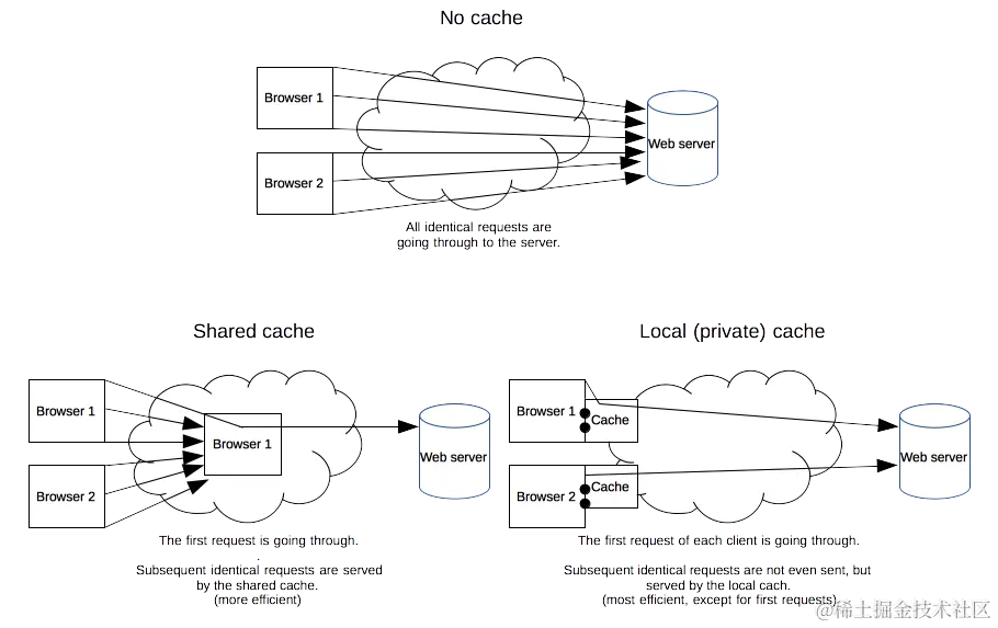 缓存的种类有很多,其大致可归为两类:私有与共享缓存。共享缓存存储的响应能够被多个用户使用。私有缓存只能用于单独用户。本文将主要介绍浏览器与代理缓存,除此之外还有网关缓存、CDN、反向代理缓存和负载均衡器等部署在服务器上的缓存方式,为站点和 web 应用提供更好的稳定性、性能和扩展性。