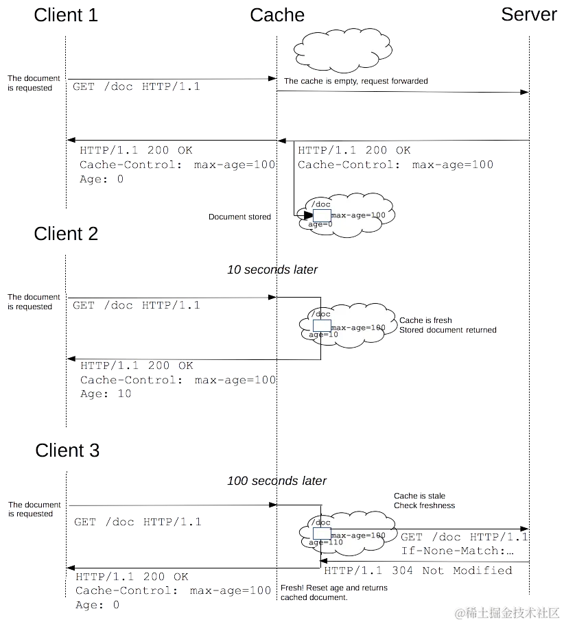 对于含有特定头信息的请求,会去计算缓存寿命。比如Cache-control: max-age=N的头,相应的缓存的寿命就是N。通常情况下,对于不含这个属性的请求则会去查看是否包含Expires属性,通过比较Expires的值和头里面Date属性的值来判断是否缓存还有效。如果max-age和expires属性都没有,找找头里的Last-Modified信息。如果有,缓存的寿命就等于头里面Date的值减去Last-Modified的值除以10(注:根据rfc2626其实也就是乘以10%)。