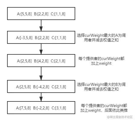 接着每次进行判断,看谁的curWeight最大则调用谁,同时调用者的curWeight=curWeight-totalWeight,最后每个提供者的curWeight=curWeight+weight。