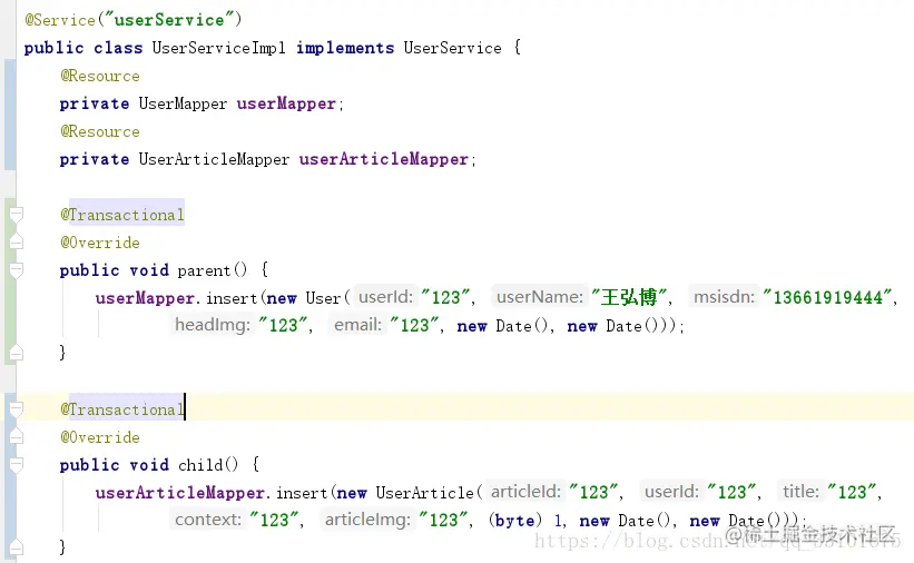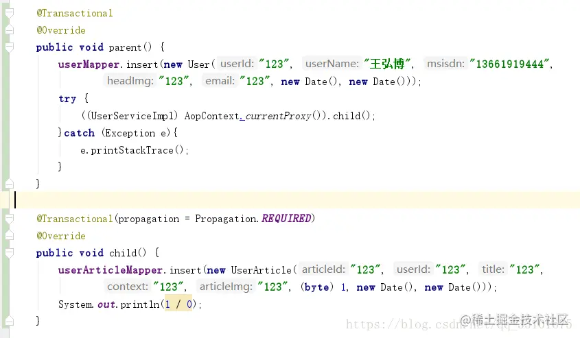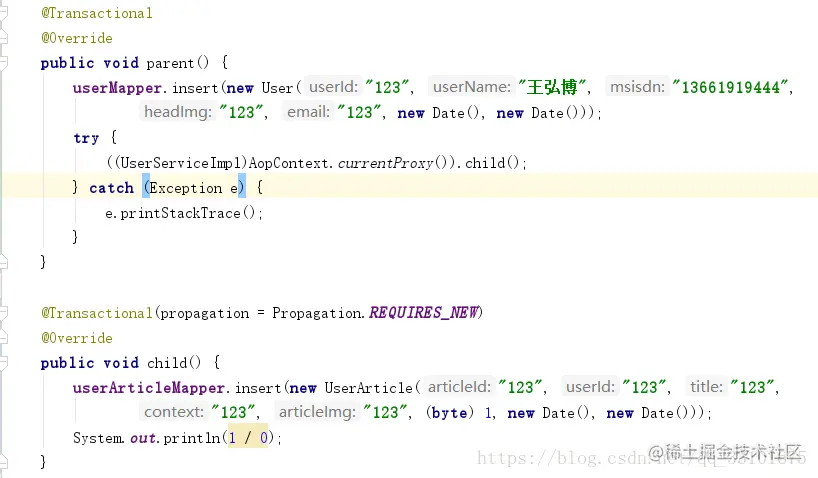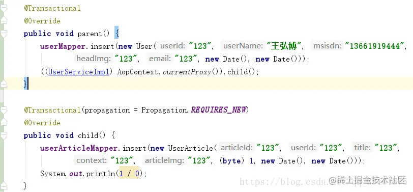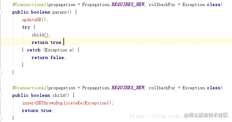 主方法parent()里调child()方法,当child()抛出异常时,parent()和child()均未回滚。这是因为parent调child方法,就是在调一个普通方法,即使child()上写了@Transactional,其本质就是: