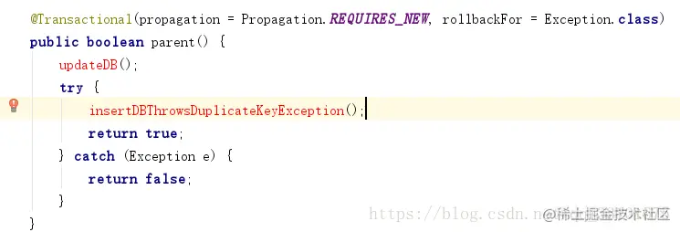 注:这里的Propagation是事务的传播行为,默认是REQUIRED,意思是如果当前没有事务,就开启一个事务,如果已经存在一个事务,就加入到这个事务中;REQUIRES_NEW是说,新建事务,如果当前存在事务,把当前事务挂起;意思是这里执行到child()方法时,parent所在的事务就会挂起,方法child就会起一个新的事务,等待方法child的事务完成以后,方法parent才继续执行。