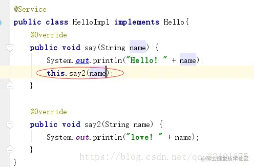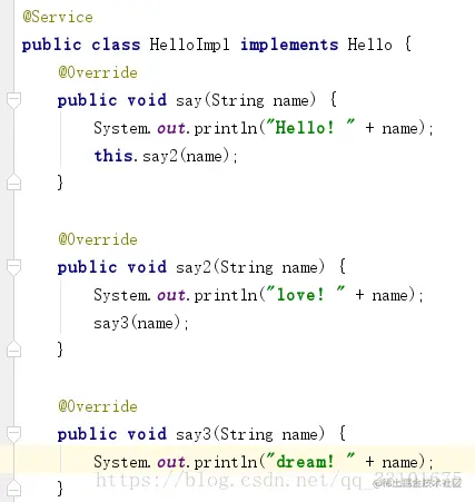 这个应该可以很好的理解为什么是这样子!这是因为在Java中say()中调用say2()中的方法,本质上就相当于把say2()的方法体放入到say()中,也就是内部方法,同样的不管你嵌套了多少层,只有代理对象proxy直接调用的那一个方法才是真正的走代理的,如下: