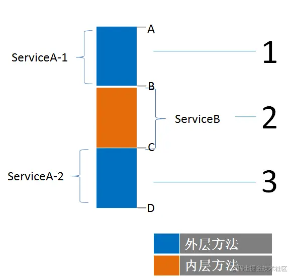 并且, 在 ServiceB#methodB 执行时 ServiceA#methodA 的事务已经挂起了 (关于事务挂起的内容已经超出了本文的讨论范围)。