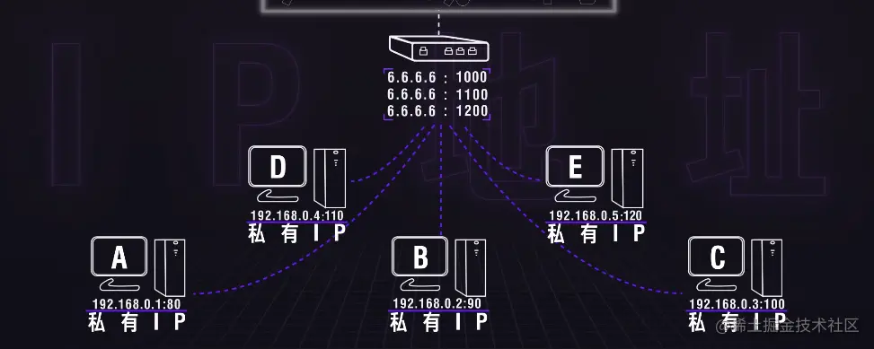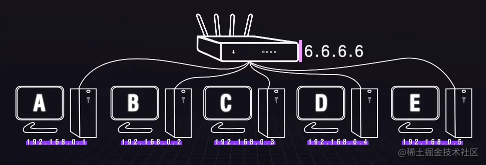 这样,就算你和别人家有重复的IP也没有关系,因为你是通过6.6.6.6的地址网关(路由器)与广域网连接,(即NAT和端口映射)