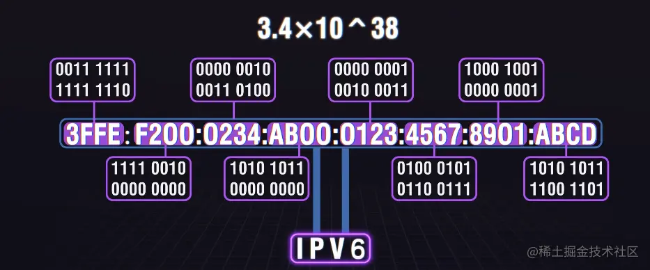 IPv6横空出世,大概长这样: ABCD:EF01:2345:6789:ABCD:EF01:2345:6789