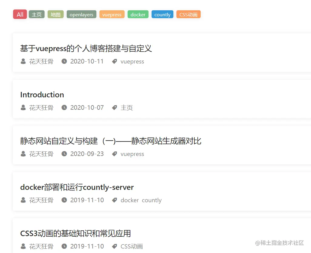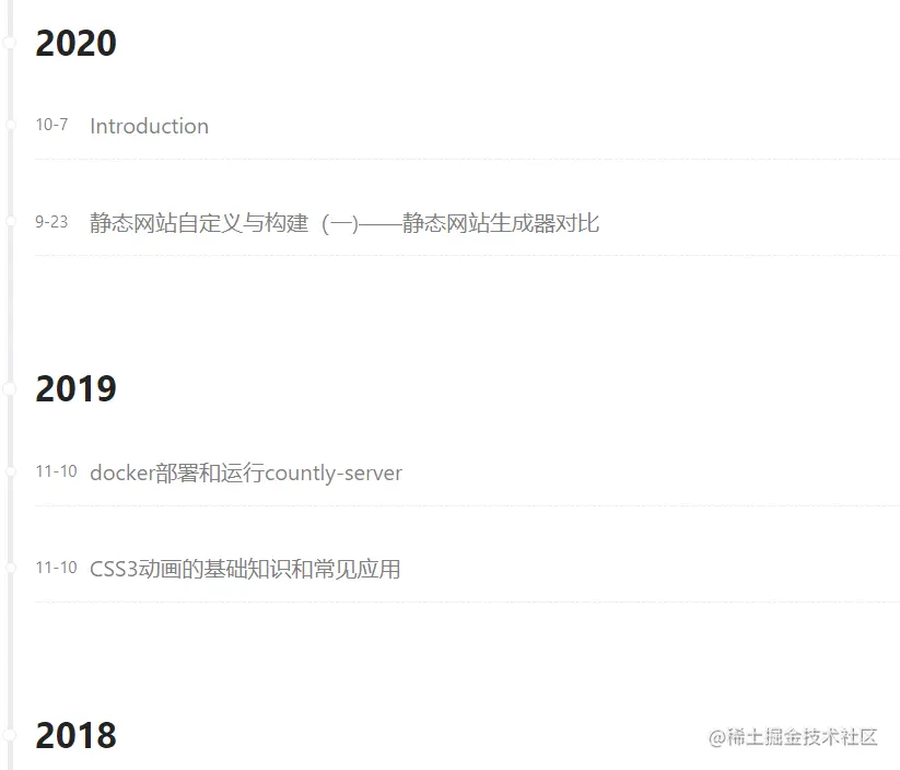 很早之前使用hexo搭建的个人博客由于年久失修逐渐被遗忘,为了激励自己多积累多动笔多思考,所以使用vuepress重新搭建个人博客。相比于hexo,vuepress定制起来也更加灵活,对于熟悉vue的前端开发者来说,完全可以编写单页组件并且运用到博客的每个角落,当然博客最终要的还是坚持思考和保持文章积累,个性化的东西说到底只是服务博客本身或者激励自己的一种手段。