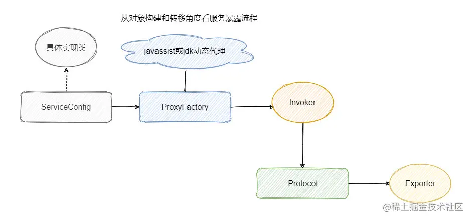 会通过 proxyFactory.getInvoker,利用 javassist 来进行动态代理,封装真的实现类,然后再通过 URL 参数选择对应的协议来进行 protocol.export,默认是 Dubbo 协议。