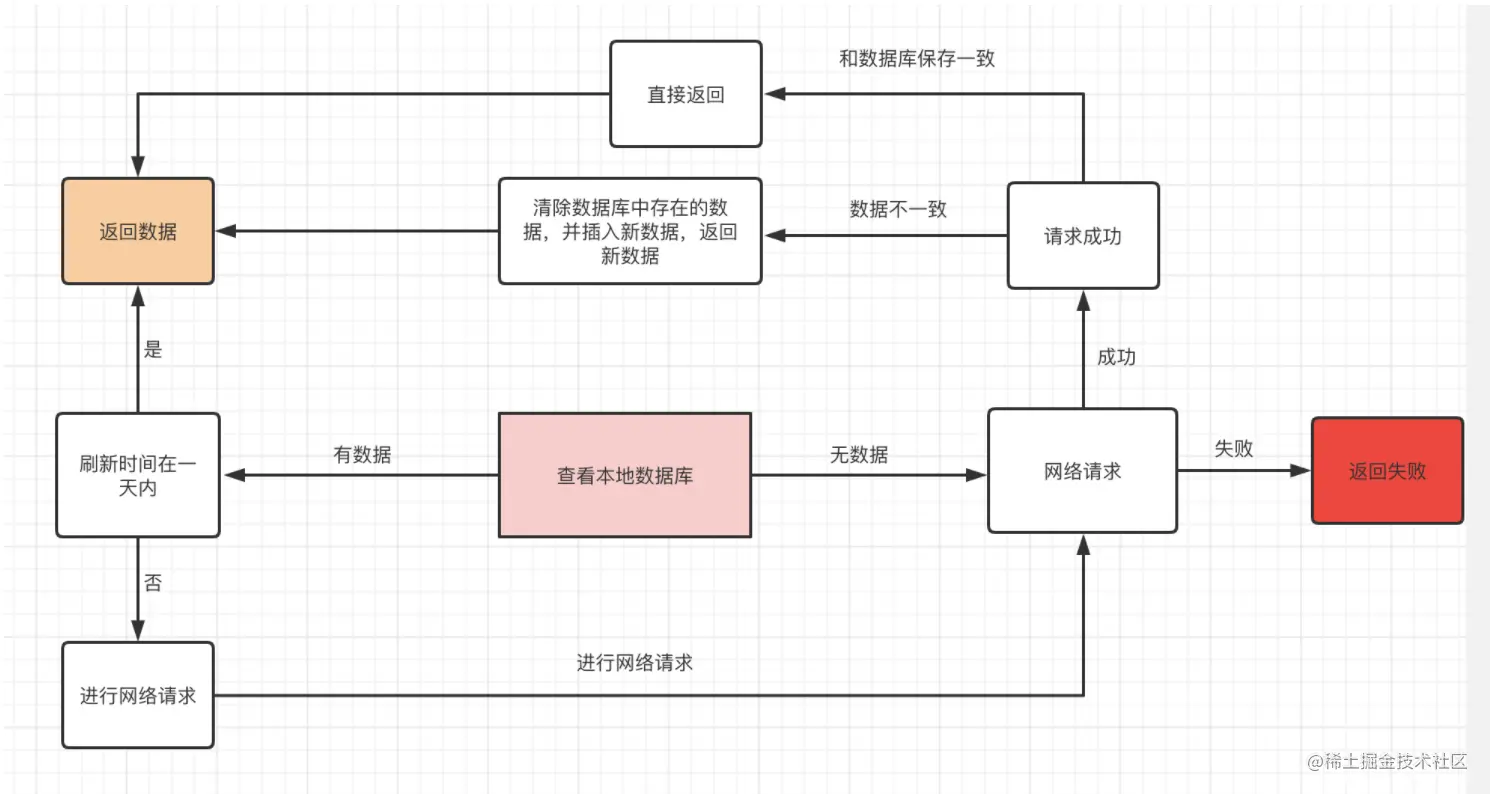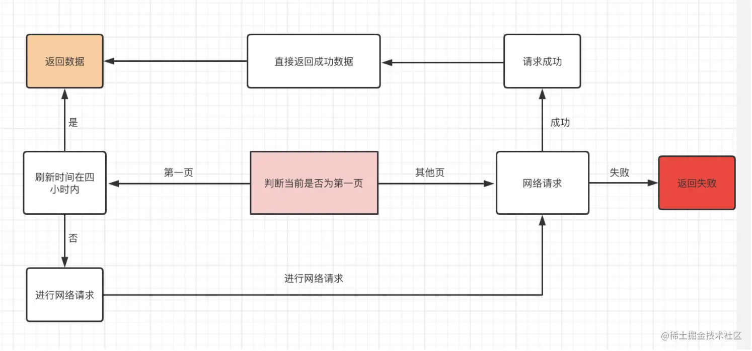 这张图其实有偷懒了,这里判断完是否为第一页之后还要依次判断置顶文章和列表文章,根据数据库的数据和网络请求数据是否一致来判断是否更新数据库的数据,再将数据返回到 ViewModel。