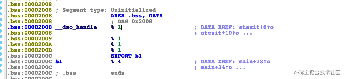 双击bss,可以看到定义的未初始化的全局变量b1,% 4表示b1占4 byte,指定对b1进行赋值时应该分配的空间大小。