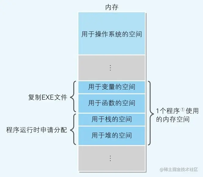 程序被加载到内存之后,使用的内存空间可分为 用于变量的、用于函数的、堆、栈,其中堆栈是程序运行时候动态分配的,用于变量的、用于函数的空间是编译器指定的,然后在程序加载到内存时候进行分配的。