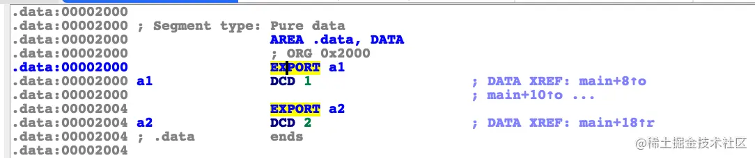 双击data,可以看到定义的两个全局变量a1和a2。dcd 1表示分配4字节空间用于存储1