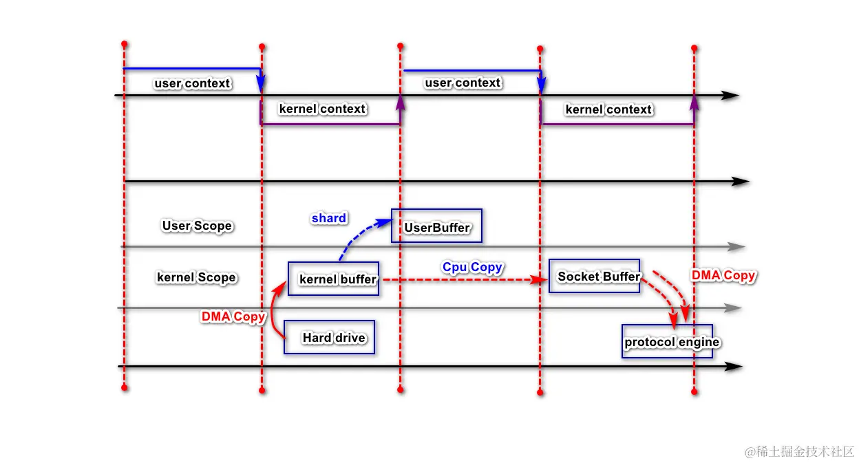 数据根本不经过用户态,直接从内核缓冲区进入到 Socket Buffer,同时,由于和用户态完全无关,就减少了一次上下文切换