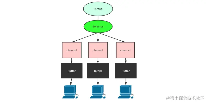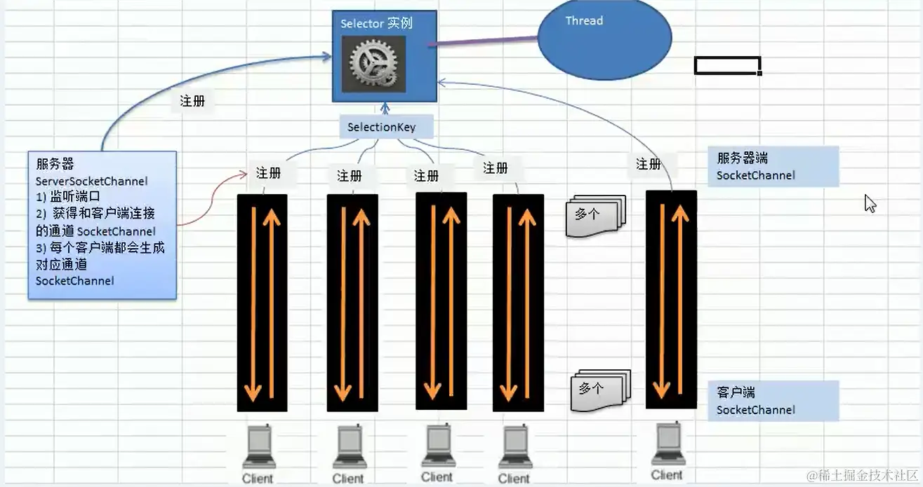 Selector 对应一个线程, 一个线程对应多个 channel(连接)