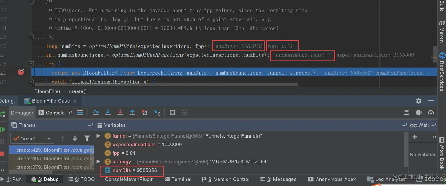 上面的numBits,表示存一百万个int类型数字,需要的位数为7298440,700多万位。理论上存一百万个数,一个int是4字节32位,需要481000000=3200万位。如果使用HashMap去存,按HashMap50%的存储效率,需要6400万位。可以看出BloomFilter的存储空间很小,只有HashMap的1/10左右