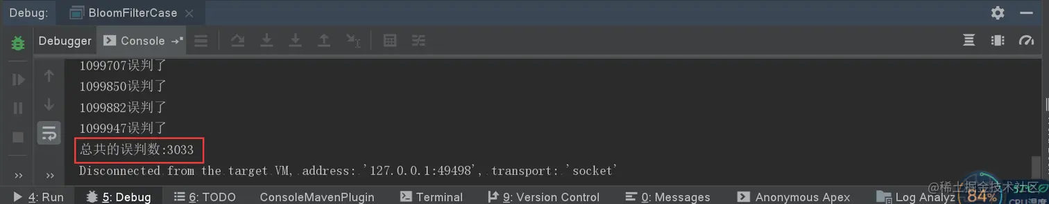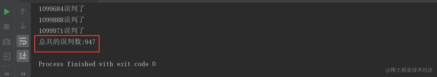 10万数据里有947个误判,约等于0.01%,也就是我们代码里设置的误判率:fpp = 0.01。