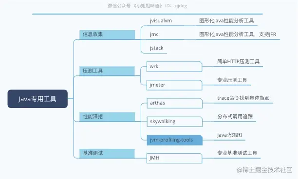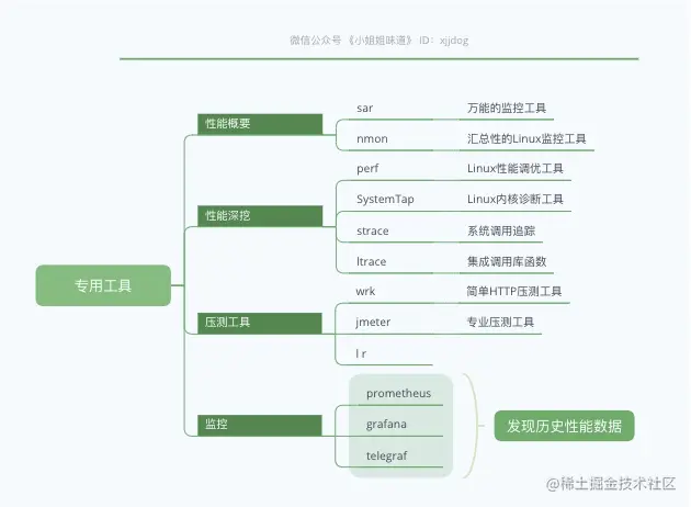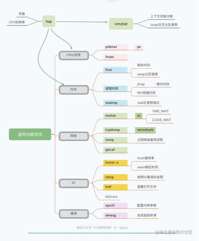 如上图,就是xjjdog平常所使用的性能问题排查工具集合,可以排查一些通用的性能问题,比如CPU、内存、网络、I/O等。