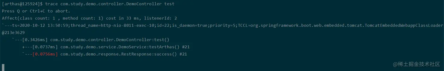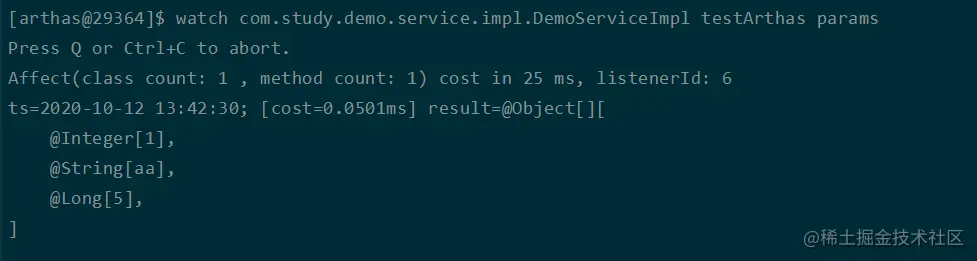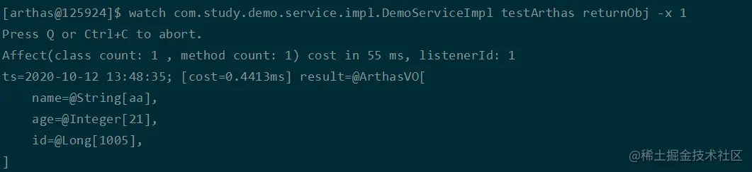 watch com.study.demo.service.impl.DemoServiceImpl testArthas params - 查看返回值