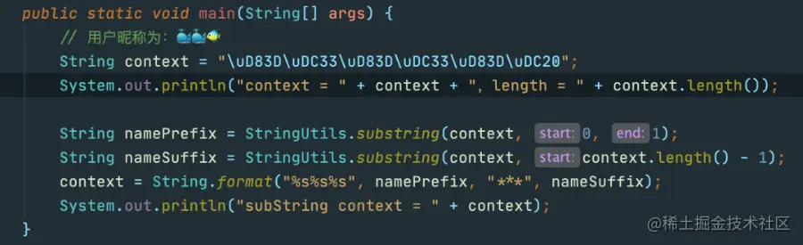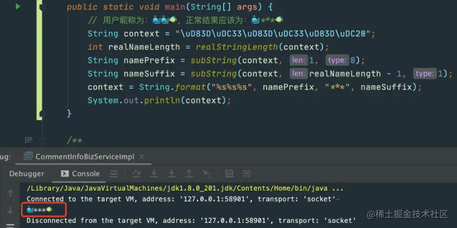 // 用户昵称为:🐳🐳🐠,正常结果应该为:🐳***🐠