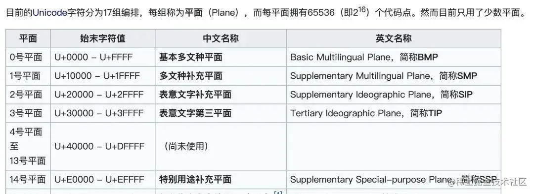 之后,Unicode 联盟发现 65536 个整数也不够分配的,于是就索性一次性又把之后的 16 个 65536 的数字即 65536-1114111 的整数资源给占了,然后把多占的 16 个 65536 的段分别命名为 16 个平面,加上原来的 0-65535 平面,Unicode 总共有 17 个平面。比如第 1 平面就是 65536-131072。当然,到目前为止,还只分配了 7 个平面出去。