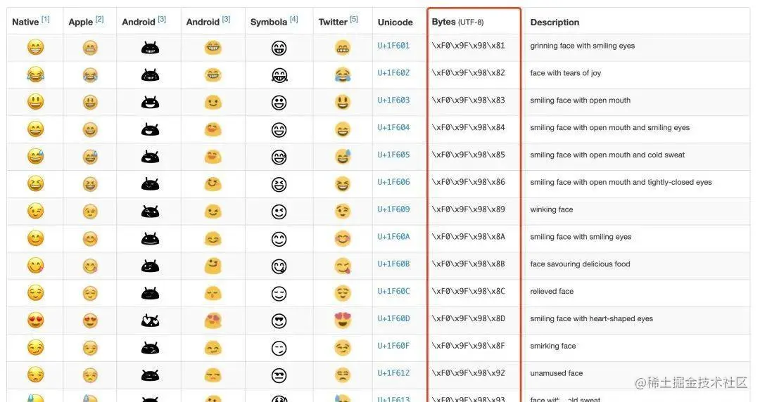 这个表格中包含了所有的 emoji 以及它所对应的 unicode编码,同时也有对应的utf-8编码的实现。