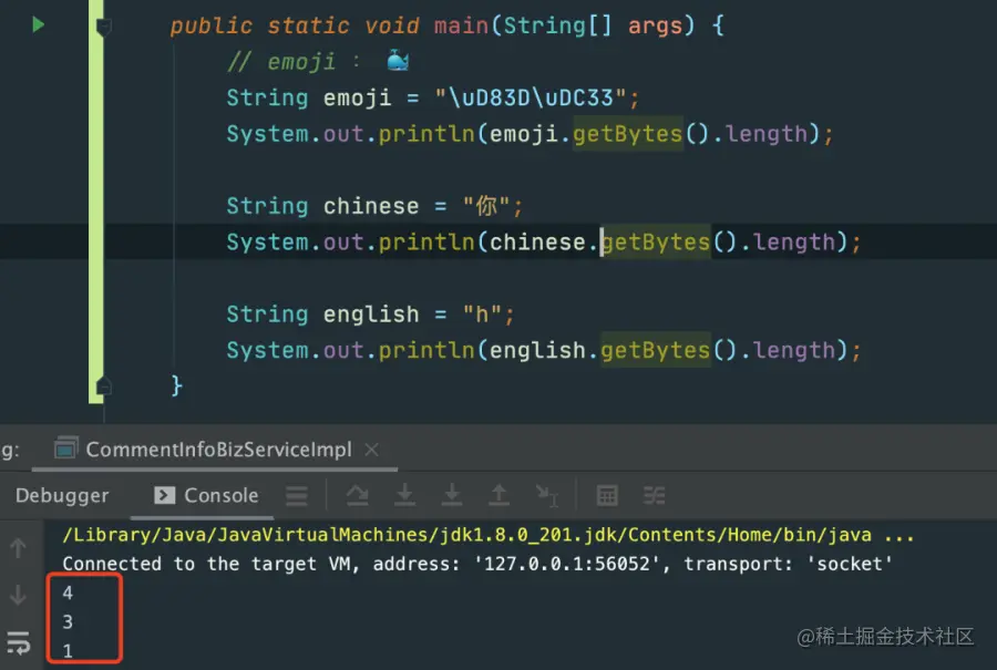 同样我们也可以在java代码中看看emoji占用几个字节长度: